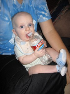 Wednesdays are my favorite. I get to hang out with a bunch of other mommies and swap notes on what Isaac and the other babies are doing, how we’re all feeling, how much sleep we are/are not getting, etc. It’s a lot of fun to watch all of the baby boys and see how they are all growing every week. It’s also a really nice break from sitting at home and nursing alone. Isaac and I also usually learn something new. Yesterday, we learned that plastic water bottles are tasty!