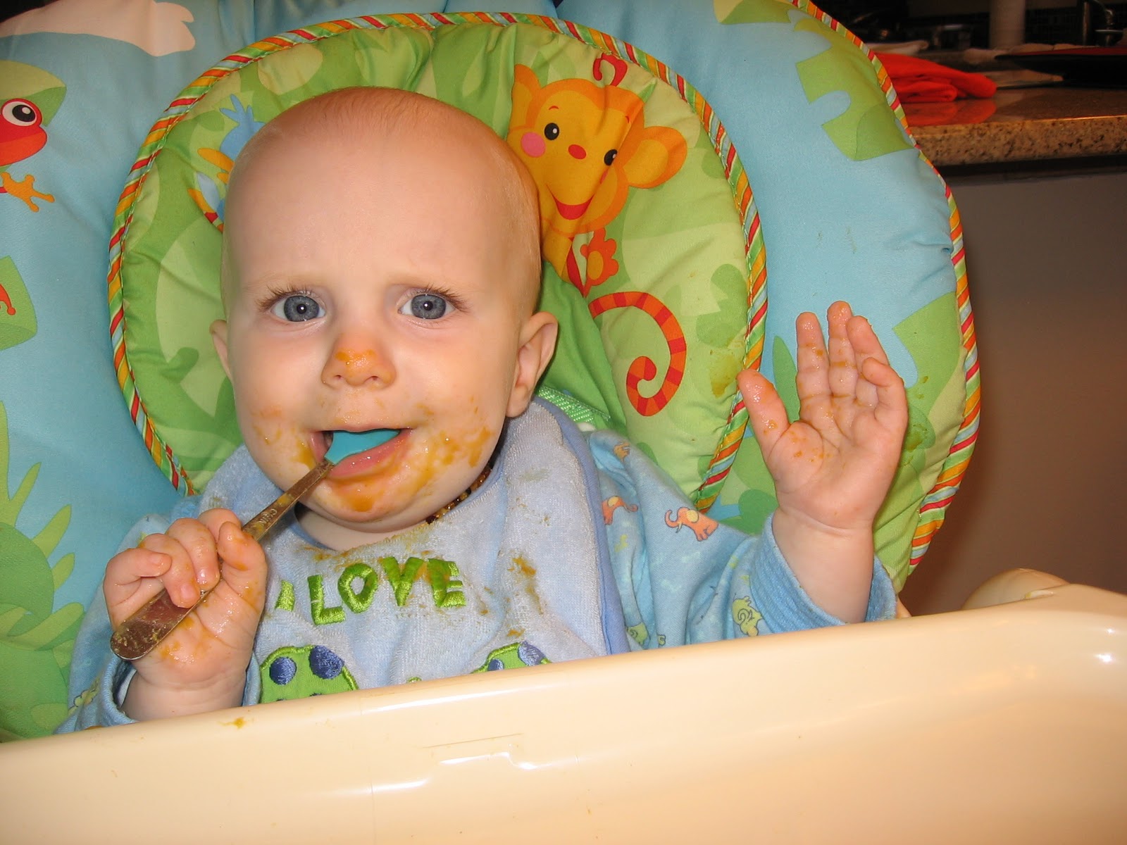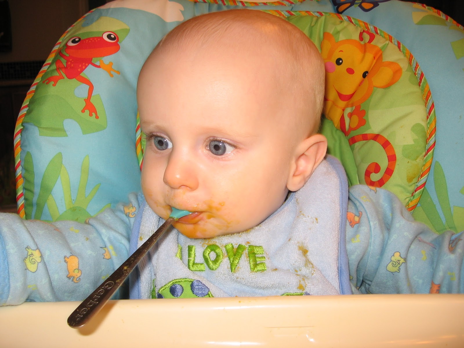 There’s not much to report from Austin today since I managed to get 3 posts up last night. Isaac is currently sleeping, although I forgot to give him his Tylenol, so we’ll see how long it lasts… We went to Crawlers/Toddlers yoga this morning and he crashed for a really good nap in the car on the way home. I just had to take every back-road available to make sure he was in the car long enough and didn’t wake up the second I walked him into the house. When he woke up, I gave him some milk before feeding him some squash. I guess I’d fed him too much before this because he doesn’t normally make as big a mess as he did today. He had fun with his squash. I got some cute pictures that I just have to share.