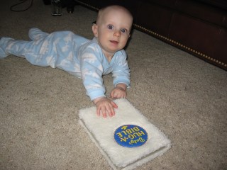 Auntie Kristin and Uncle Dave got Isaac a “Hug-A-Bible” for his baptism. Isaac is totally captivated by the soft cover on the outside of the book. I’ve read him the stories, but he also just enjoys playing with the cover on it.