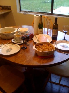 Let’s just say that today did not go at all as planned. We *thought* we were going to spend the morning at home and then head over to dinner at the Stolpes’ house around 2:00. However, Isaac woke up with a fever this morning (I knew he slept too well last night!). His temperature hovered at around 101 degrees all day. Poor little guy. He wanted someone to hold him at all times and wanted to sleep most of the day. It worked out alright for us. We had most of the fixin’s in the pantry, so Todd went out to get turkey to complete the meal. We had turkey, dressing, green bean casserole, cranberry sauce, and gravy. It was a darn good dinner; if I do say so myself. The green bean casserole was the trickiest part. It had to be dairy-free. So I used Golden Mushroom soup instead of the standard Cream of Mushroom. That should have been the biggest change to the recipe. It wasn’t. After I’d started to put the food together, I realized that I didn’t have any more plain rice milk – only chocolate and vanilla. I had used the last 2 cups of plain milk to make (also dairy-free) potato soup last night! Oh no!!! The solution? Mix some of the potato soup in with the Golden Mushroom in order to thicken up the sauce for the casserole. It wasn’t all bad, actually. I’m not saying it would be my first choice, but…
