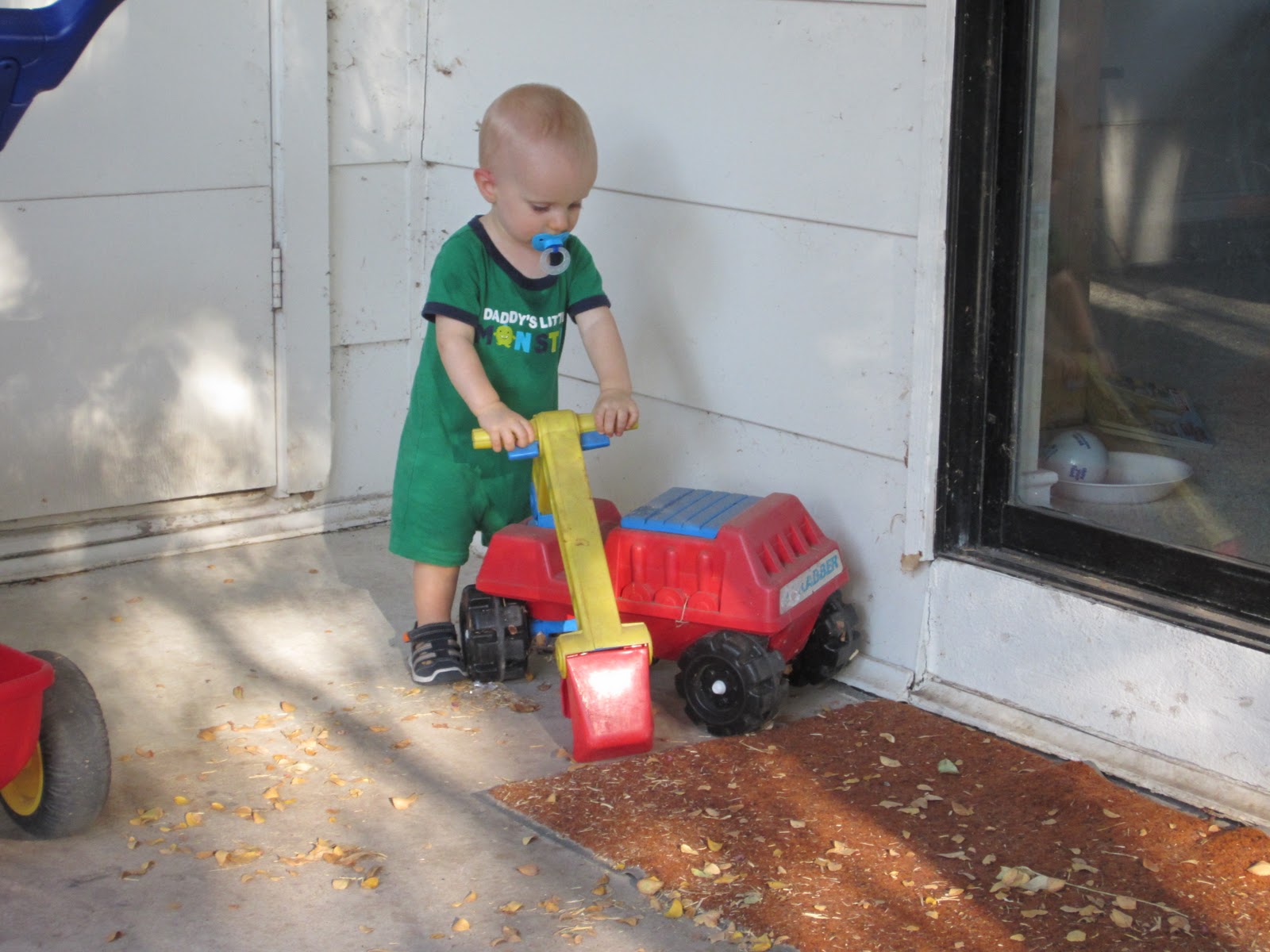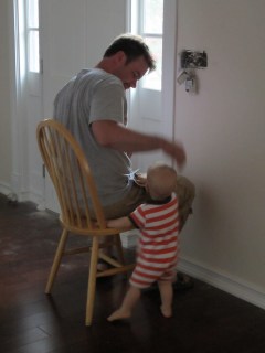 Isaac, Jackson, and I took refuge in the back yard. Jackson found some sticks.