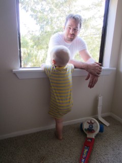 Isaac trying to climb out the window to join his dad: