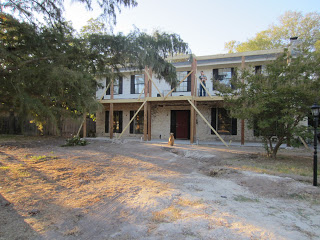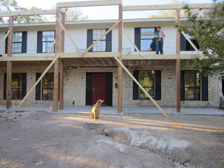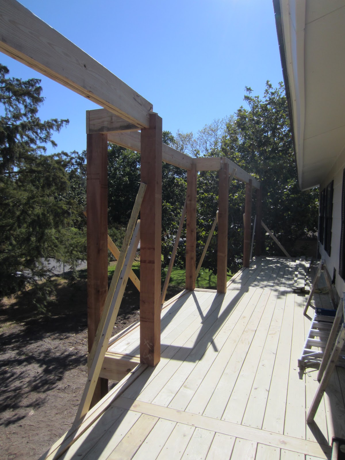 More progress on the porch today! They started putting up the support columns for the roof today. Tomorrow they are supposed to begin tearing off the existing roof so they can tie in at the ceiling height. It was bizarre to see people walking outside the window while I was at the computer this afternoon. 🙂 Isaac didn’t mind, though! The guys occasionally wave or say “hi” to him when they see him. Since I know they notice him, I hate to be holding the camera up in the window trying to capture them working… Thus, we only take pictures at the end of the day.