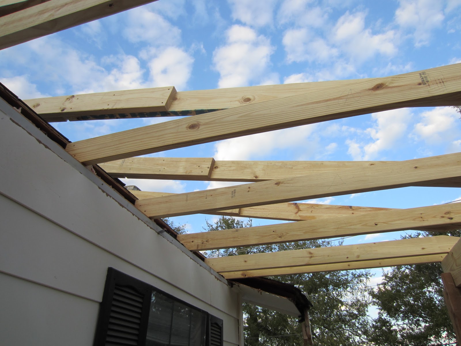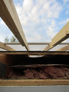 Looking up into the rafters. There is white plastic sheeting over the top, exposed portion of the attic. It blew like crazy in the wind last night. At the bottom of the photo, you can see our attic insulation, the roofing that did not have to be removed, and then the new rafters on top.
