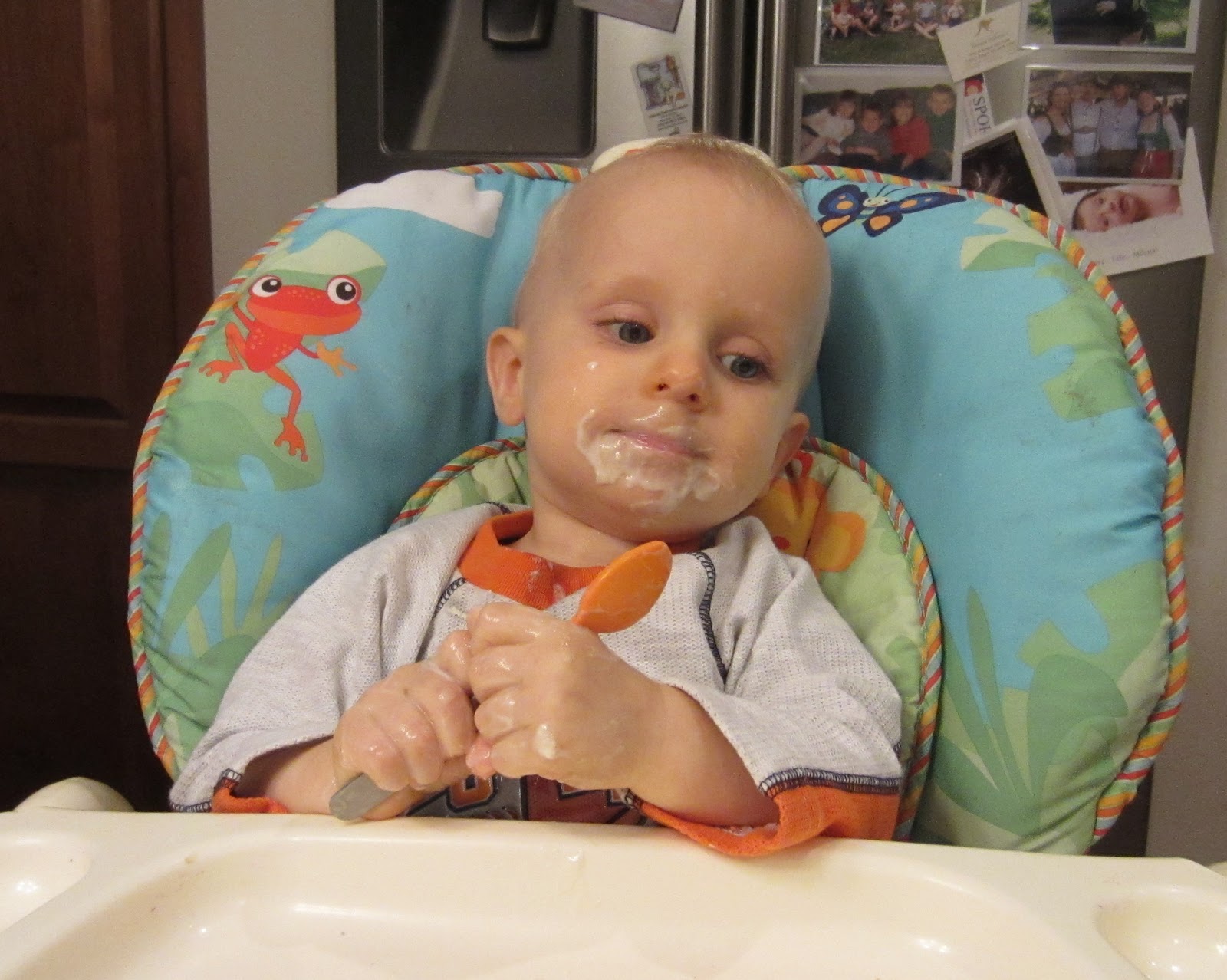 Finally, one more picture of the kiddo. Still working on self-feeding. He’s making a mess, but he loves it. 🙂 This was peach/squash yogurt with dinner.