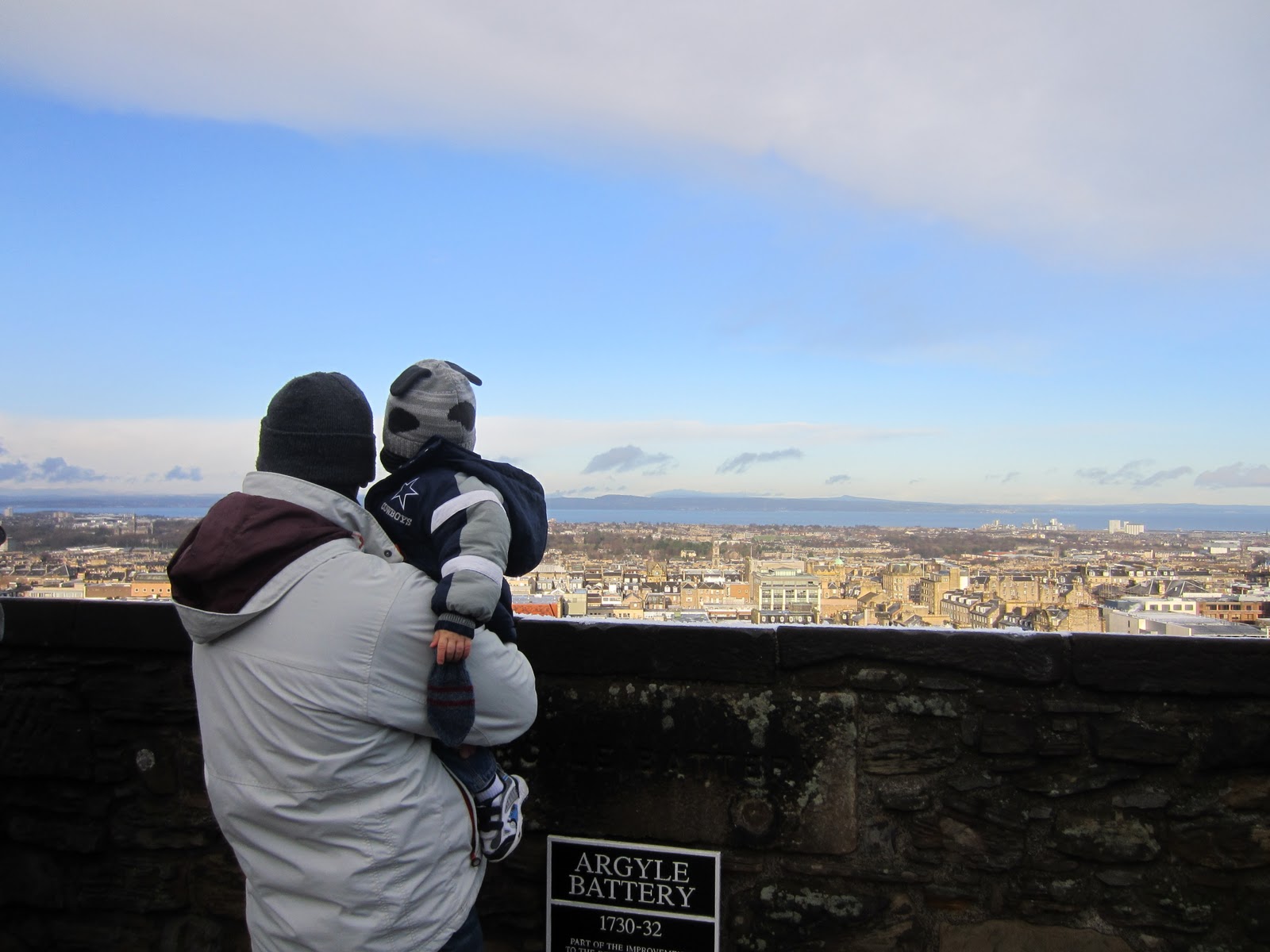 The first day in Edinburgh, we walked up to the castle. It was snowing when we woke up, but warmed up to be a wonderful day for walking. The stroller we borrowed for Isaac had a plastic rain cover, which worked well for keeping him warm as we walked. He was a trooper for being in the stroller as much as he was.