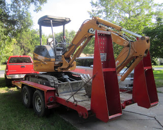 Ha! I bet you thought this post was going to be about Isaac, didn’t you? It is, but mostly it’s about Todd. 🙂 As all 3 of my readers will remember, we had a lot of work done recently to connect our house to the city sewer line. As that project was wrapping up, Todd had some pipe installed to run sprinklers. This weekend, he’s started digging up the rest of the yard to install the sprinklers. He’s rented a mini-excavator so that he can dig up around the yard to bury the pipes. He’s also going to work on leveling and grading the front yard some. It’s been a MESS since the front porch project… You really have to watch your step.