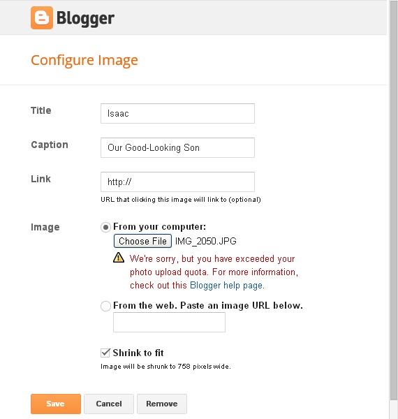 I am having a tough time with this blog. I am trying to update the picture at the very top. While it is an adorable picture of Isaac, I’d like it to show both kids. Does anyone know how I can change it? When I tried to add a new photo, I got this: