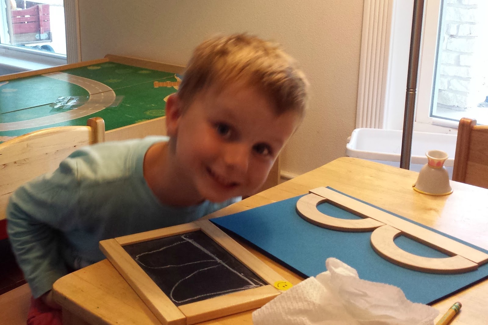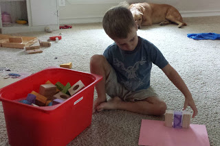 Then we practice again by writing it in his workbook. He’s less thrilled about having to write the letters so much smaller, but he’s working on it. He’s such a perfectionist that he tends to get upset if it isn’t just like he wants, so I’m thankful for erasers!