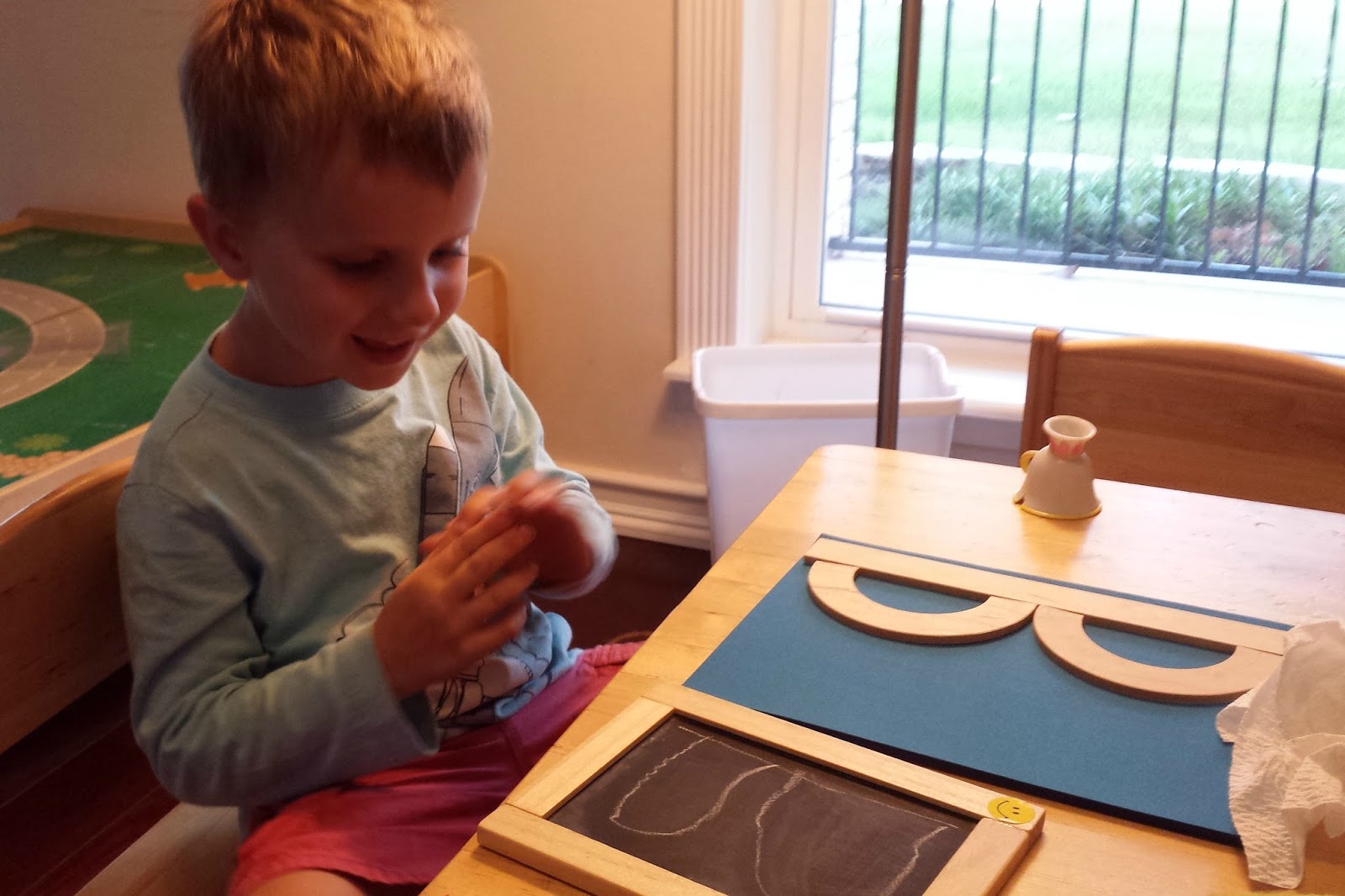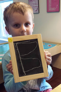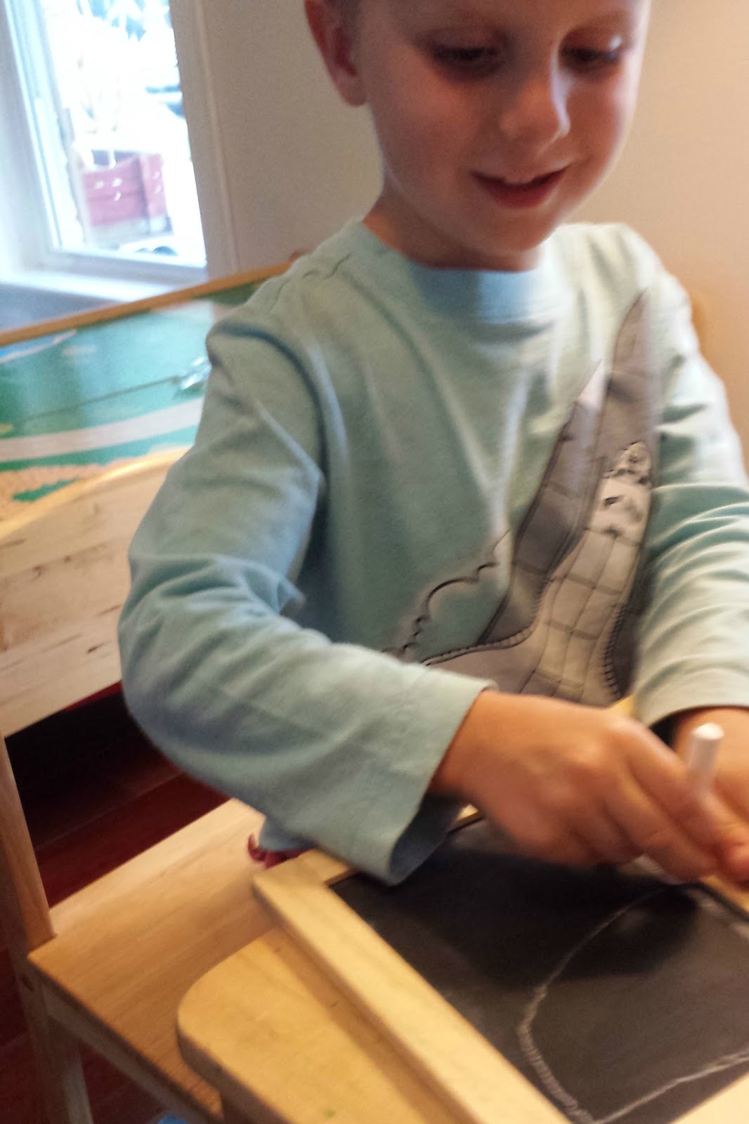 This is a neat program. It’s called Handwriting Without Tears. First, we “build” the capital letters using big lines, little lines, big curves, and little curves. Then, we follow the “wet, dry, try” method. I write the letter on the chalk board. Isaac traces over it with a wet cloth, then again with a dry cloth, and then finally he draws it himself. He *really* liked this method when we tried it this week.