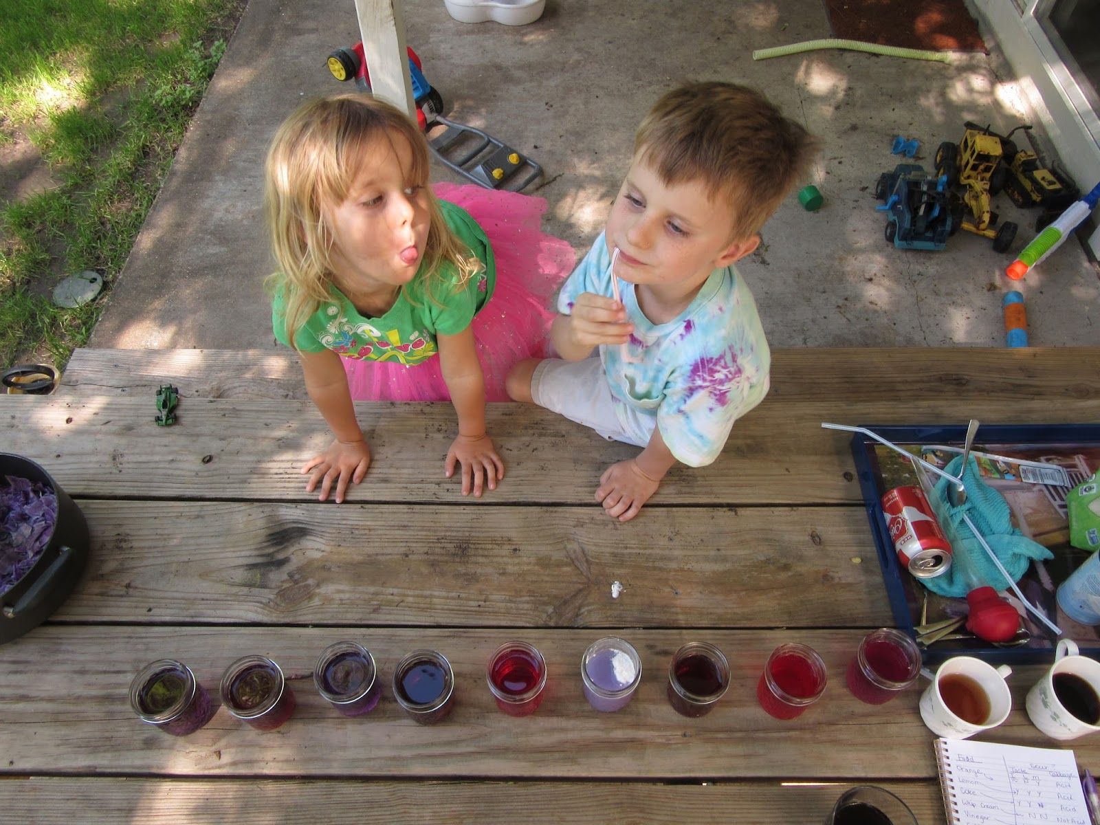 In today’s fun science news, acid tastes sour. The kids and I did a taste test on different foods. Then, we boiled water and, in a separate pot, shredded cabbage. Mom warned me that boiling cabbage might leave an odor behind, so I set everything up on the picnic table after the water came to a boil. I poured the boiling hot water over cabbage leaves and we let that combo cool for 30 minutes. Then I poured the strained cabbage water (which was now purple) into separate jars. Here’s our initial set-up: