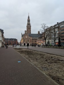 The first place we visited was furnished. It has more modern furniture than we’d choose ourselves, but when they say “furnished,” they mean that even the kitchen drawers are stocked, so we have plates, cups, silverware, and cooking utensils. And light fixtures. It has wood floors, a great kitchen floor plan, a microwave, and a large (by European standards) refrigerator. Then we discovered an entirely separate fridge in another room hidden in a closet! Todd and I stepped out of the sliding doors in the living room to see what we could see from the deck. IT OVERLOOKS THE LIBRARY NEXT DOOR!!! As Todd said, “we’re done here, aren’t we?” Why yes, yes we are. Winner, winner, chicken dinner!!! It does have some interesting quirks: the master bathroom has a bath/shower and a sink. Notice what’s missing? The WC is down the hall. And that same master bathroom also has no door. Here’s the link if you’d like to check out the space – note that the windows of the building you see (in pics where you’re looking at the deck) are the windows of the Library building. We are also about 1 1/2 blocks from the rear of St. Peter’s Church, which shares a square with the historic Town Hall at the heart of town. It is mere steps from several places to eat or drink, numerous bookstores, and only a couple of blocks from grocery stores.
