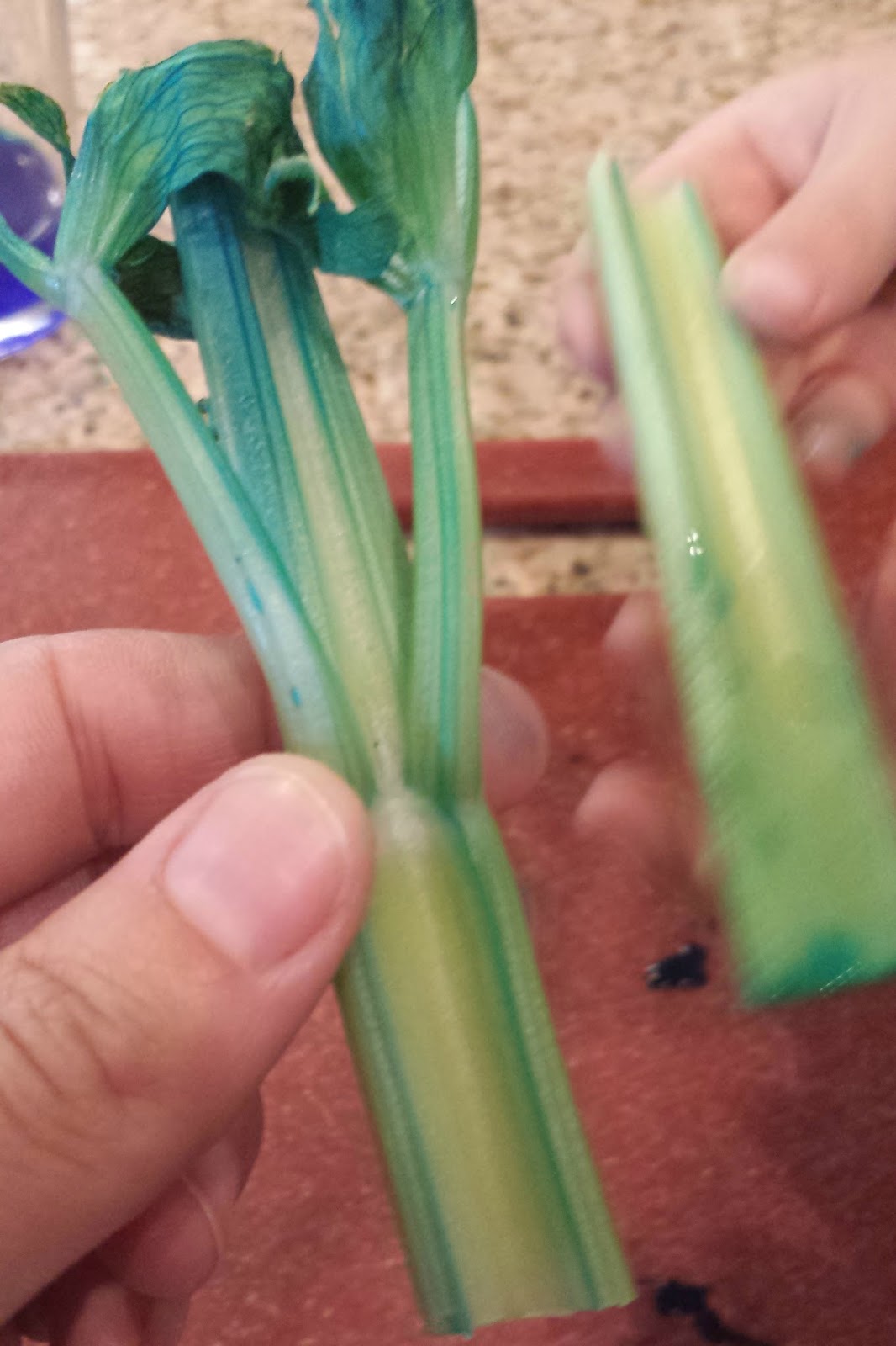We learned about how plants send water to their leaves. Then we demonstrated it using blue food dye, water, and some celery stalks. The kids had fun checking the celery every 15 minutes to see whether it had changed. After the leaves turned blue, the kids cut the celery stalks to see the blue capillaries. Laine displays the end of hers…