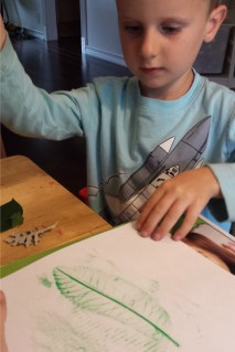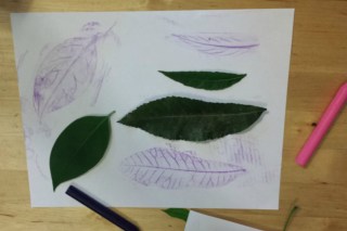 We read about leaves and how they work and then collected leaves from various plants around our yard. We got a fairly impressive collection of them and used them to do leaf rubbings.