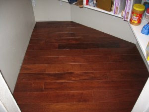 After lots and lots of hard work on Todd’s part, I am happy to report that we have hardwood floors! He finished them this morning by laying the remaining pieces in the pantry. We calculated that we would need 800 square feet of wood. We purchased 850 square feet. We have 2 boxes, (44 square feet), left over. Todd managed to create very little scrap!