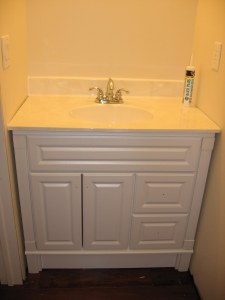 Isaac is officially a Walter now that he’s been to Lowe’s twice in one day. We originally had 3 bathroom vanity candidates. The first, and most viable, option was the vanity in the original half-bath. That one completely disintegrated when we moved it to the garage a few months ago. The other 2 were from the master bath. We needed to fill a 37″ wide space. One vanity was 32″ wide; the other was 39″. Back to Lowe’s!