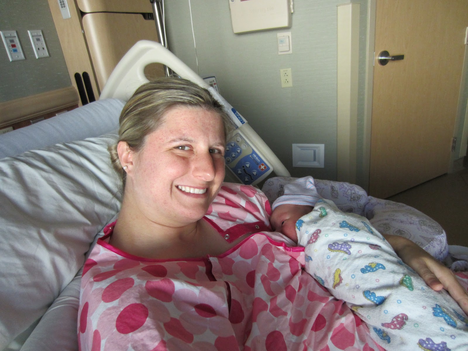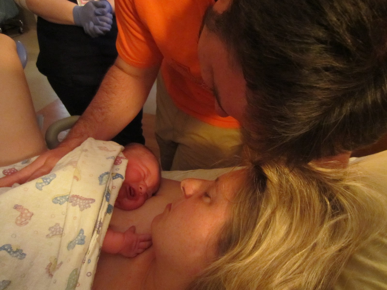 I remember looking at the clock sometime around 12:45 and thinking that if I could have her in the next 5 minutes, she’d be born at the same time as Isaac. That time came and went. I did a lot of yelling at Andrea, who blessedly did NOT yell back at me. I admit I was a bit of a weenie. I got so tired that I was SURE I wasn’t going to be able to get this baby out. Thankfully, someone suggested I have some cranberry juice to get a little sugar energy to push us to the finish line. (TW: Again, she was a rock star, pay no attention to her comment on being a weenie, she did this all with no drugs. I wanted drugs just watching!) I told Andrea to just “Get her OUT!!!” about 200 times. At one point, Andrea said that if I really wanted her to, she could do that, but that wasn’t the birth story that Laine wanted to have. I am incredibly glad that she knew what my heart really wanted and didn’t listen to the things I *thought* I wanted when the going got tough. Toward the end, literally the very end, she said, “Heather, you can meet your little girl in 3 more pushes. Can you give me 3 more good pushes?” I told her I couldn’t. She told me she was going to ask Todd, Liane, and Shelley and see what they thought. I wanted to kill her. 🙂 Liane reminded me of a mutual friend’s phrase that “We can do hard things.” I briefly considered killing her, too. (TW: Thank goodness we had all these other people in the room. Not only did we really have a great birth team but somehow I was never the focus of Heather’s anger.) Then the next rush came and I began pushing. After that one, I thought, I only have to do that 2 more times! I pushed through the next contraction and Andrea told me to look at her. I didn’t think I could open my eyes. I did. WOW!!! I looked down and Andrea was holding my daughter’s head. As she turned her head, the rest of her little body slid right out and Andrea laid her on my chest! It was so incredible!!! (TW: It was also fairly scary. Again, thank goodness we had such an awesome birth team. Laine was grey and limp and didn’t look good. Only the positive happy faces around me convinced me that everything was OK. It was awesome and scary at the same time).