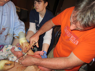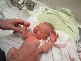 We waited a few moments for the cord to stop pulsing and then they clamped it so Todd could cut it. I believe the placenta was delivered a minute or two after that. It was a tremendous relief once that was out! Todd and one of the nurses took Laine over to clean her up a little and to measure her. Andrea sewed up some tearing I had done during all of the pushing.