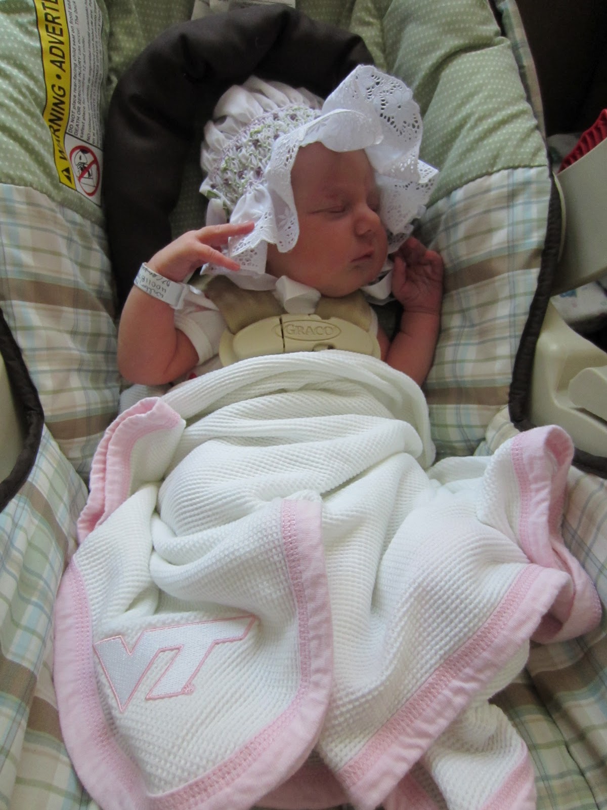 ADORABLE bonnet made by Grandma and a VT blankie from Aunt Krissy: